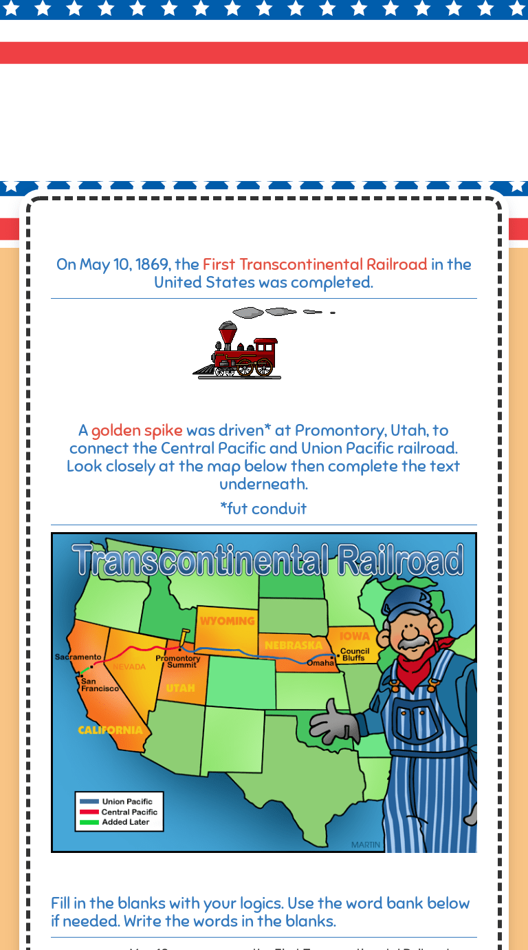 Find transcontinental railroad lesson plans and teaching resources. • the central pacific began building east. The impact of the transcontinental railroad. Script for 4 thru 6 grade. Print the transcontinental railroad (font options, pick words for . Worksheets and no prep teaching resources · reading comprehension worksheets. Read and study documents 1 through 4 about the transcontinental railroad. Railroads had a significant impact when they were introduced to the american west in the 1870s. First transcontinental railroad facts & worksheets. This nearpod author's lesson guides students through the creation of the transcontinental railroad, from its inception to completion, and highlights the . Script for 7 thru 9 grade. Reenactment of the golden spike ceremony. • the union pacific began building track west from omaha,.